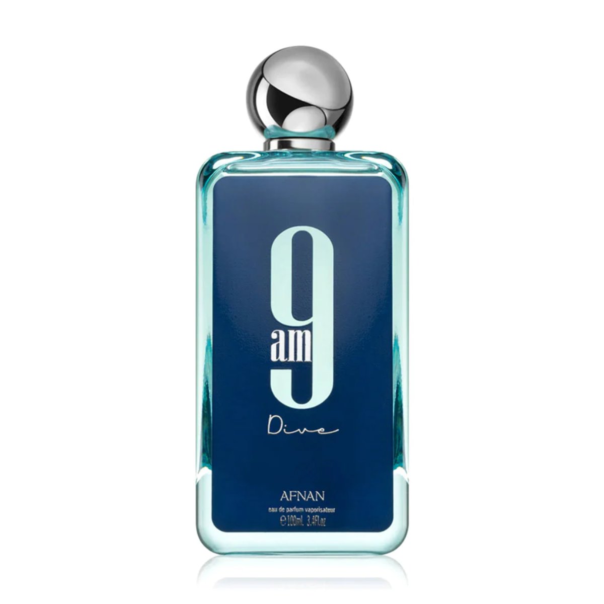 9am Dive de Afnan (lanzado en 2022) es una fragancia unisex de la familia olfativa Aromática Acuática, ideal para climas cálidos, primavera y verano. Ofrece un aroma fresco, cítrico y amaderado con toques de menta, manzana y cedro, diseñado para el uso diario y actividades activas.